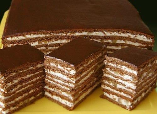 Коржи перемазать заварным кремом, посыпая орехами. Оставить при комнатной температуре на 1 - 2 часа, чтобы коржи пропитались.