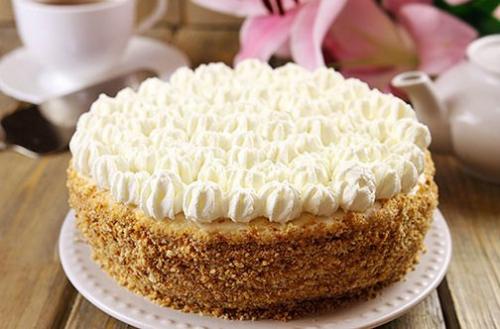 - На круглое блюдо поочередно выкладывать остывшие коржи и наносить крем. Сформированный торт остудить в холодильнике и выровнять оставшимся кремом по бокам и сверху. Сверху можно выложить грецкие орехи.