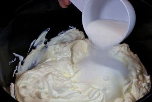 1. размягченное сливочное масло мы растираем с сахаром и ванилином. Добавляем сметану, перемешиваем.