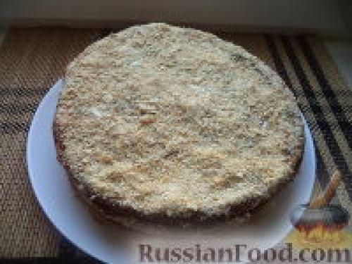 Смазываем получившимся кремом поочерёдно все коржи, кроме последнего – он используется в качестве посыпки. Не забываем промазывать бока. Готовый торт отправляется для пропитки в холодное место (желательно на 24 часа).