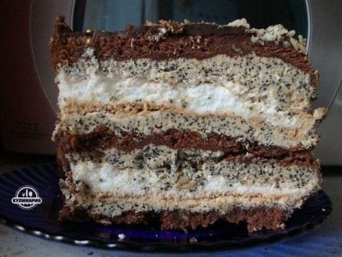 Крем: 2 стакана мака растереть 1 стакан сахара - залить кипятком "Наглаз", чтобы масса распарилась (приблизительно 1 стакан. Охладить до комнатной температуры. 500 г сливочного масла взбить и понемногу добавлять маковую массу.