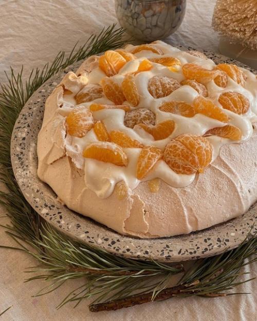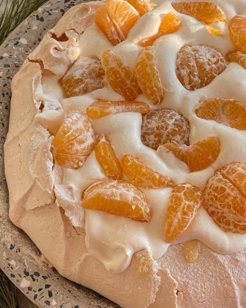 Собирать торт просто. В углубление меренги сначала наливаем курда, потом сверху крем из взбитых сливок (его тоже взбиваем долго до пиков с сахарной пудрой), сверху мандарины, ягоды, что любите).