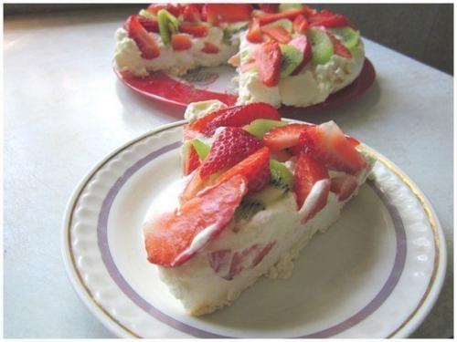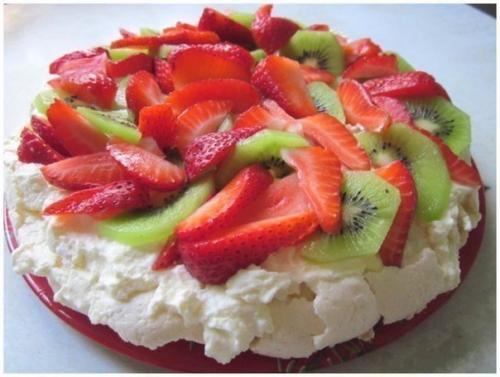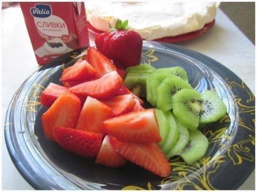 Фрукты и ягоды вымыть, обсушить и порезать. Сливки в течении 4-5 минут вбивать. Добавить 2 ч. л. сахарной пудры с ванилью. Перемешать. Готовый крем аккуратно на безе выложить. Украсить ягодами и фруктами. Торт готов. Приятного аппетита!