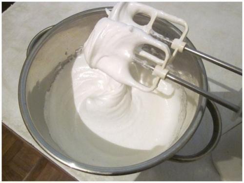 В белки добавить уксус и взбивать на небольшой скорости. Как только белки взобьются в устойчивую пену, начинайте понемногу добавлять сахар. Взбиваем минут 5-7, мы добавляем крахмал. Безе готово.