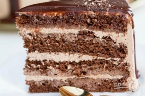 По кругу также хорошенько промазываем торт кремом, не забываем о бортах. Поливаем шоколадной глазурью и отправляем в холодильник для пропитки. Подаем к столу холодным, приятного аппетита!