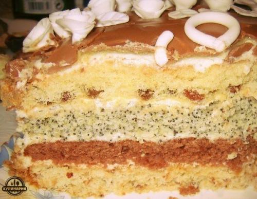 Всё смешать и добавить в один корж изюм, в один корж какао, в один корж мак, в один корж орехи по вкусу.