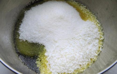 1. масло (100 грамм) кладем в миску и растапливаем в микроволновой печи, мы всыпаем мак. Добавляем кокосовую стружку. Для аромата всыпаем немного ванили, добавляем сахарный песок.