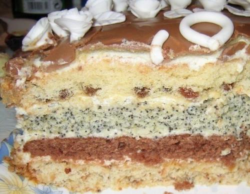 Коржей всего четыре: с изюмом, какао, маком, орехами.