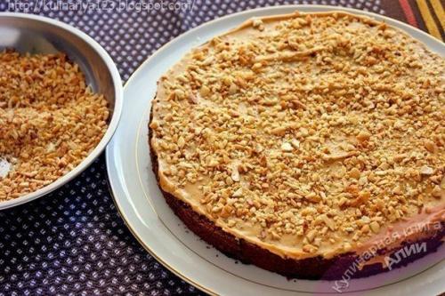 Смазать поверхность половиной крема, густо посыпать орехами.