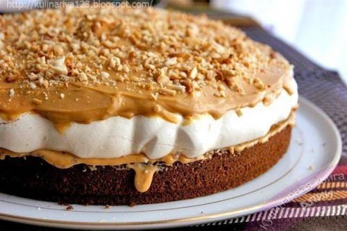 Накрыть коржом - безе, также смазать кремом и обсыпать орехами.