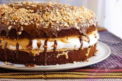Сверху положить бисквитный корж, чуть придавить. Залить шоколадной глазурью и посыпать орехами.
