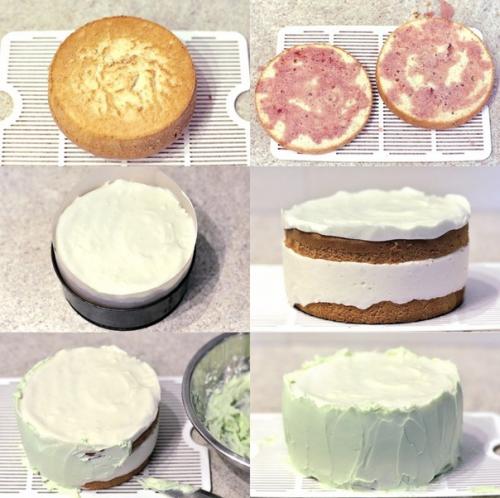 5. для декора можно использовать шоколад, а можно сделать крем из крем - чиза и сгущенного молока, как в моем случае и капнуть туда немного красителя мятного цвета. Смазать кремом борта, раздробленным печеньем украсить нижний "Этаж", а сверху "усадить" ягоды малины.