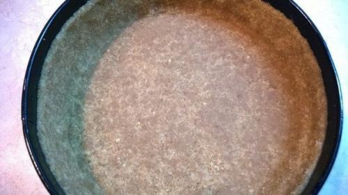 2. разъемную форму 21 см хорошенько смазать сливочным маслом, выложить тесто, с бортиком. Утрамбовать. Мы отправляем в разогретую до 160 гр духовку на 10 минут, в зависимости от вашей духовки. Корж должен хорошо подрумяниться.