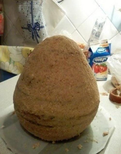 2. далее делаем "Картошку". Обрезки перемалываем на блендере и смешиваем или со сметаной (если позволяет состав торта ее применить), или с остатками крема, или со сливками. И придаем нужную форму и гладкость нашей конструкции.