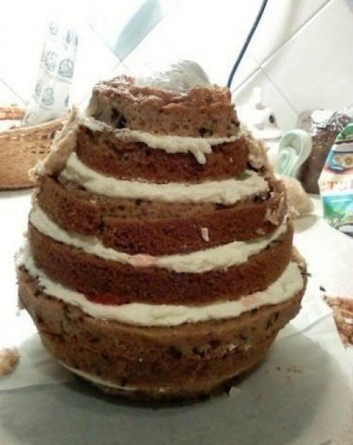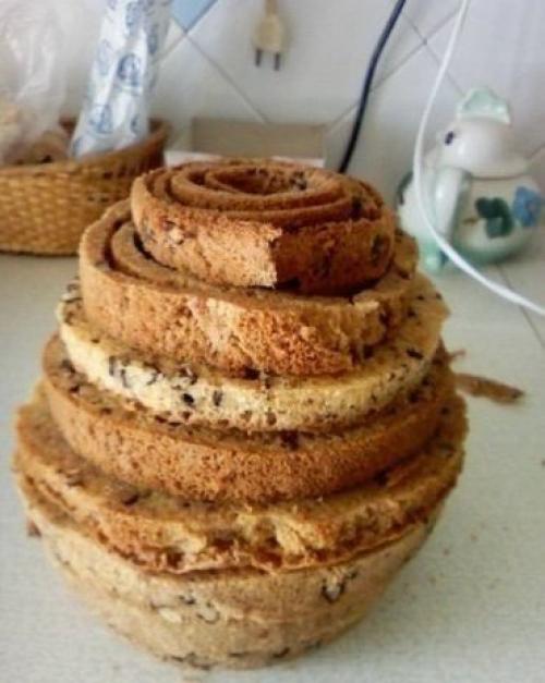 1. мы выпекаем коржи в круглой форме любого диаметра, которые вам нравятся (автор советует делать для таких тортов коржи на маргарине или сметане, чтобы торт не потерял свою форму. Готовим крем (в данном случае сливочно - творожный. Вырезаем коржики разного диаметра. То что осталось от вырезания, улиткой складываем как очередной слой (делаем как на фото. Промазываем кремом.