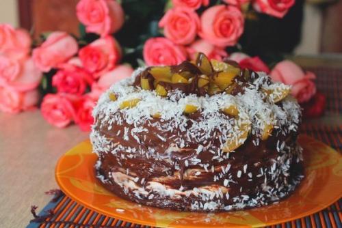 Приготовление: коржи смазать кремом, можно добавить фрукты (у меня были персики консер. И бананы), украсить на свой вкус) я украсила шоколадом, персиками и кокосовой стружкой, супер получился тортик) приятного аппетита!