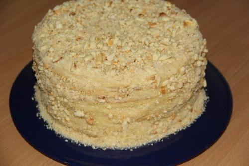 На плоскую тарелку или подставку под торт выложить корж, хорошо смазать его тёплым кремом и накрыть следующим коржом. Таким образом собрать весь торт. Обрезки от коржей измельчить и смешать с измельчёнными орехами. Торт хорошо смазать со всех сторон кремом, а затем посыпать ореховой крошкой. Поставить торт в холодильник на ночь. Приятного аппетита!