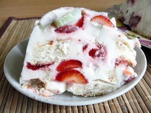 1. взять удобную "Тару", выстелить ее пленкой, выложить тонко нарезанным рулетом. Взять мягкий творог, вспушить его блендером и положить 4-5 столовых ложек сахара.