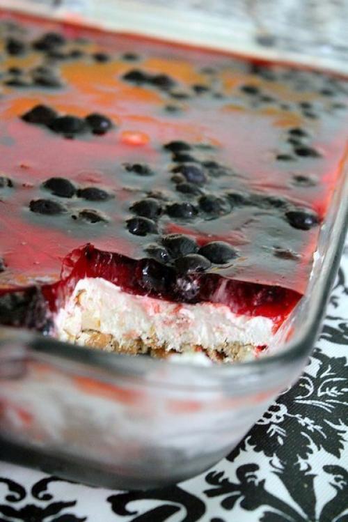 Сделать любое желе и добавить ягоды или фрукты. Остудить желе и вылить на средний слой. Дать полностью застыть в холодильнике. Десерт холодным подавать. Приятного аппетита!