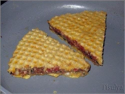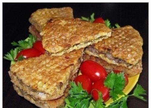 Распределить готовый фарш по коржу, накрыть сверху вторым, аккуратно прижать по всей поверхности и дать полежать минут пятнадцать, чтоб коржи немного увлажнились от фарша и не крошились при нарезке. Затем нарезать как пиццу или торт - треугольными кусочками. Обмакнуть в яйце и жарить с двух сторон на сковороде на среднем огне до готовности.