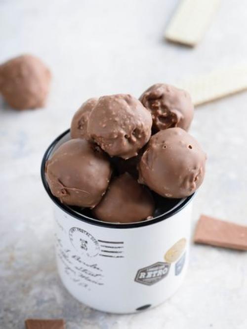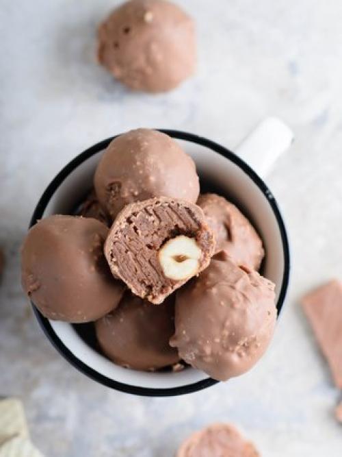 Редко готовлю домашние конфетки, не помню, как решила сделать эти, наверное любопытство сыграло роль. Но они были съедены за 1 день! Спустя неделю я повторила и крайне ими довольна! Я люблю трюфели только домашнего приготовления и в 90% из темного шоколада, но аромат молочного в перемешку с поджаренным фундуком и хрустящей вафлей вскружат голову кому угодно!