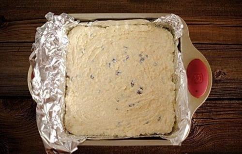 4. если смесь получилась слишком сухой, добавьте немного сметаны. Должно получиться густое вязкое тесто. 5. Выложите тесто в форму, застеленную двумя слоями фольги и смазанную маслом.