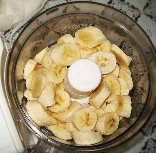 1. для начала необходимо взять 3 банана, очистить от кожуры, превратить в пюре в блендере. Затем в блендер добавить творог, снова перемешать.
