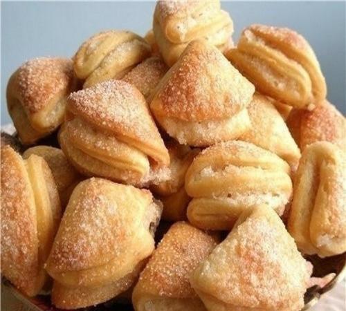 На половинку каждого кружка высыпаем немножко сахара, мы сворачиваем из кружочка полукруг. На четвертинку полукруга опять насыпаем сахар, и складываем полукруг в четвертушку. Выкладываем печенье на противень.
