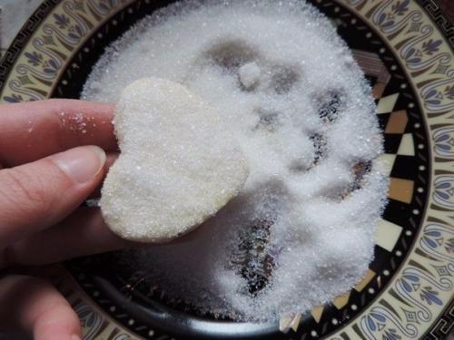4. насыпать в блюдце сахар. Готовые печеньки одной стороной макать в сахар и немного прижимать, чтоб он прилип. Печенье в сахаре выложить на противень, застеленный бумагой для выпечки.