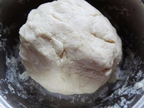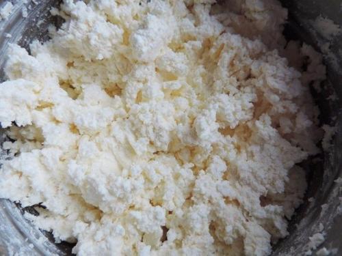 2. добавить муку с разрыхлителем. Я советую всыпать не сразу всю муку, а грамм 400, остальную добавить по необходимости. Ее точное количество от влажности и жирности творога зависит. Тесто должно быть мягким, но не липким. Готовое тесто в холодильник минимум на полчаса убрать. У меня оно там примерно час провело.