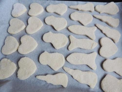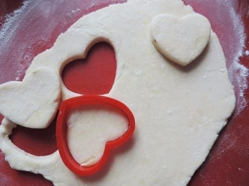 3. охлажденное тесто раскатать толщиной около полусантиметра (тонко не раскатывайте - не будет эффекта слоености. Рабочую поверхность и само тесто для удобства совсем чуть-чуть припудрить мукой. Печенье любой формы и размера вырезать.