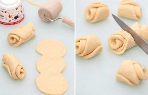 3. застилаем пергаментом (или силиконовым ковриком или просто смазываем сливочным маслом) противень. На нем розочки выстраиваем.