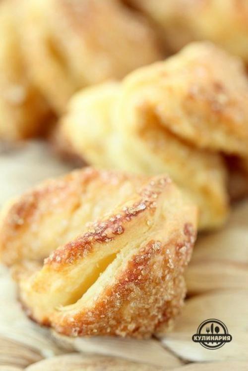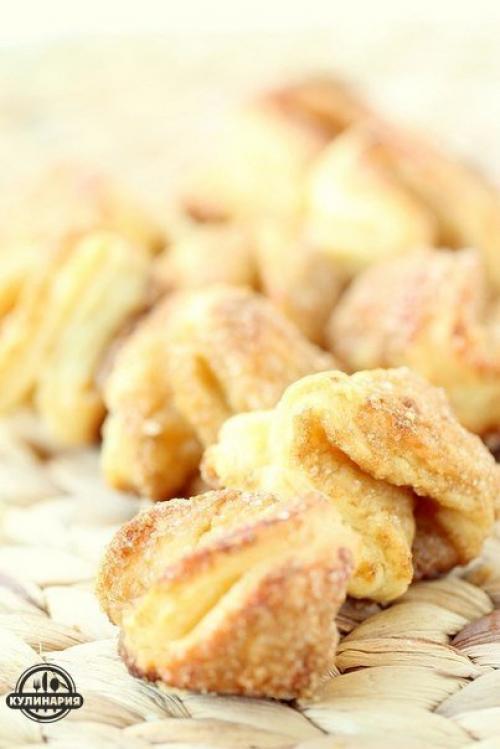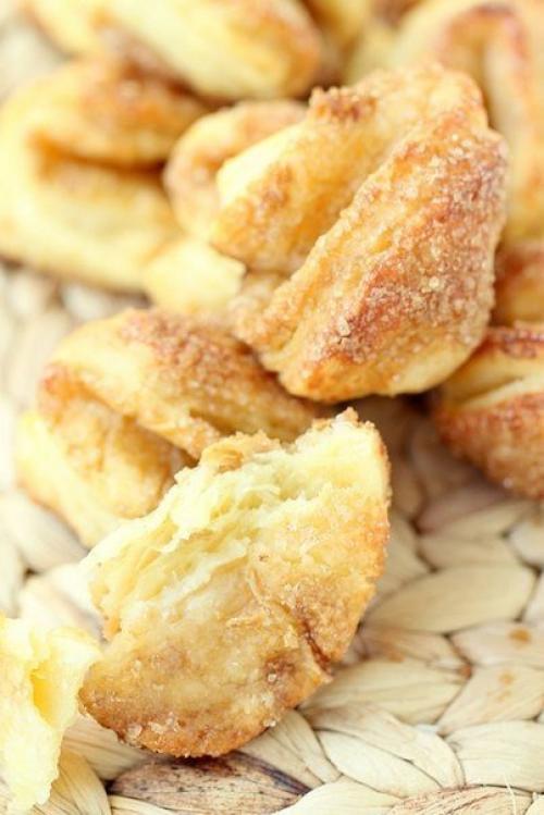 4. насыпать в мисочку сахар и макать в него кружки теста. Затем сложить кружок пополам (сахаром внутрь. Еще раз сложить полукруг пополам и снова макнуть верхней стороной в сахар.