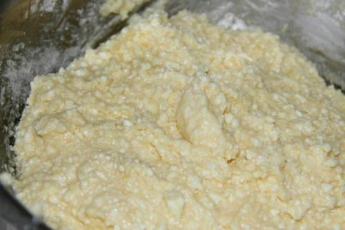 Затем просеять муку, ванилин и разрыхлитель. Добавить в творожную массу.