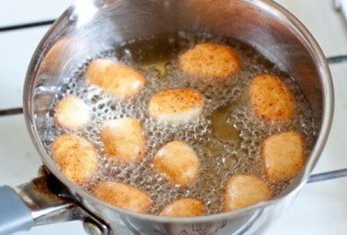 В кастрюльке на среднем огне разогреваем растительное масло. Его должно быть столько, чтобы кусочки теста в нем плавали. Порциями кладем нарезанное тесто и жарим до золотистого - коричневого цвета со всех сторон (пончики сами переворачиваются в масле;.