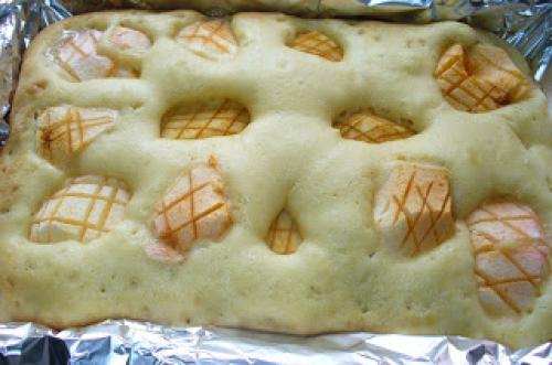 А потом выкладываем яблоки. Количество яблок может быть больше или меньше – по вашему вкусу. Часть яблок утонет в тесте, а часть – останется на поверхности.