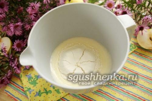 Добавьте сметану, муку и в последнюю очередь погашенную соду. Тесто для яблочного пирога на сметане должно иметь консистенцию этой самой сметаны, причем не самой жидкой.