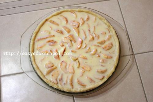 Сверху равномерно заливаю сметанной заливкой. Выступающие над заливкой кусочки яблок тоже должны быть смазаны.