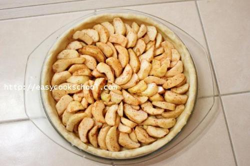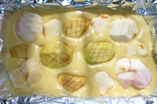 Очищенные яблоки измельчите дольками, удаляя семенные коробки. Форму обмажьте маслом. Выложите в нее меньше половины теста. Сверху разложите дольки яблок по кругу. Залейте фрукт оставшимся тестом.