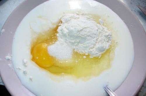 - Взять миску. Влить кефир. Насыпать соду. Отставить на пять минут. За это время кефир погасит соду.