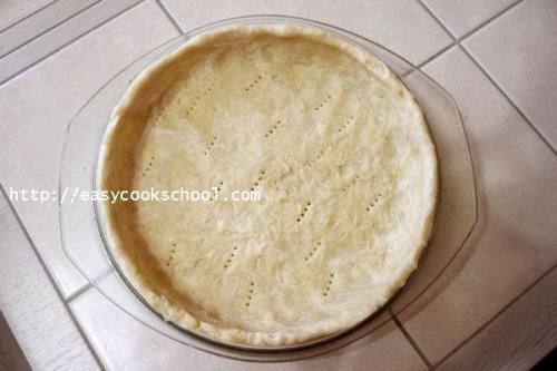 Достаю из холодильника тесто. Кладу его в форму и пальцами разминаю по всему периметру. Делаю бортики. В нескольких местах накалываю вилкой.