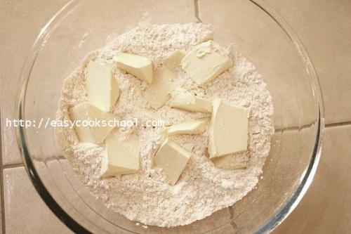В глубокой тарелке смешиваю 250 гр. муки и разрыхлитель. Добавляю размягченное сливочное масло, нарезанное кусочками.