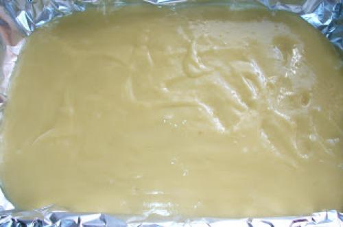 Разделим тесто на две части. Одну половину выкладываем тонким слоем в форму для запекания с промасленным пергаментом. Для выпечки следует использовать квадратную форму размерами 20 на 20 см. При необходимости используйте силиконовую лопатку, чтобы разровнять тесто.