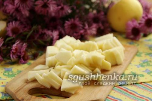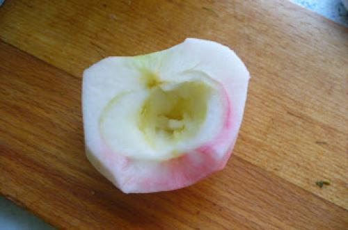- Снять кожицу с яблочек. Вырезать семечки. Нарезать.