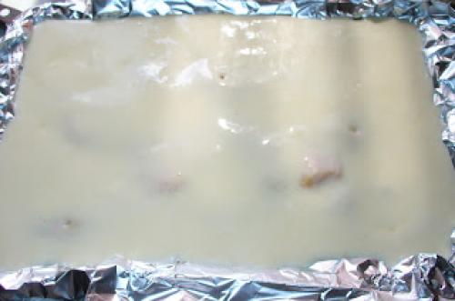 Сверху выложить творожно - белковую массу и посыпать творог оставшимся тестом.