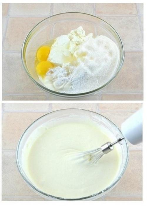 В одну емкость положить творог, сметану, сахар, ванильный сахар, яйца, крахмал, сок половины лимона.