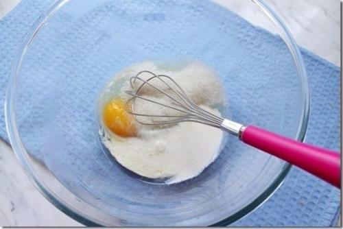 1. в миске венчиком взбить 1 яйцо, 1 ст. л. сахара, щепотку соли и 1 ст. л. сливок.