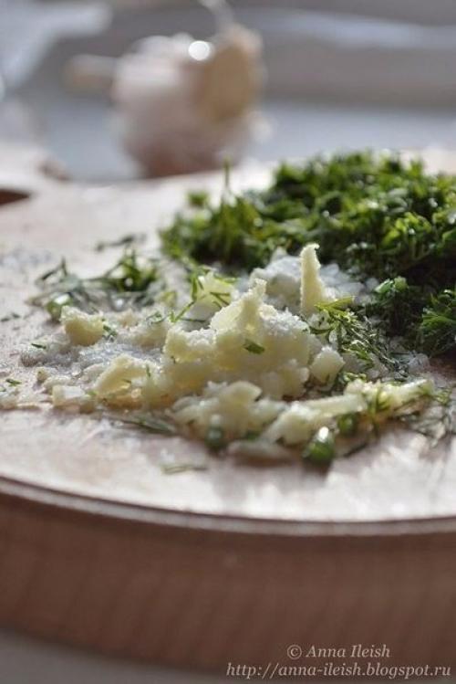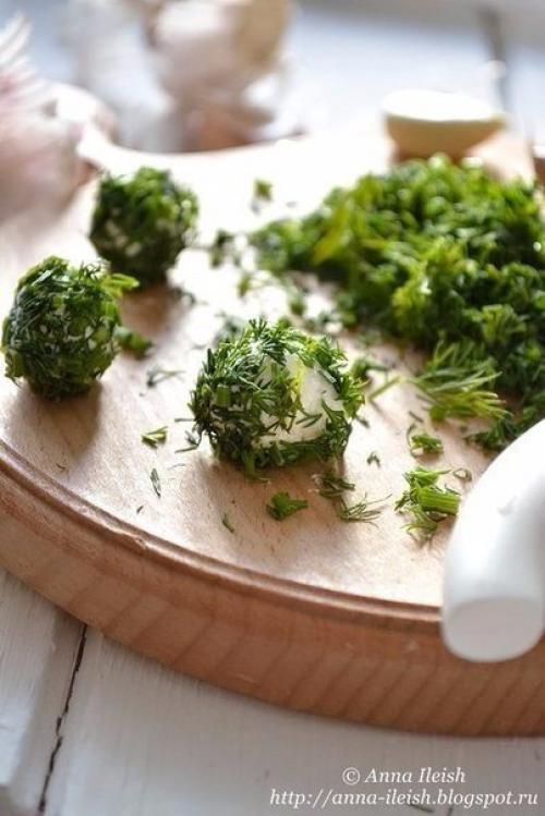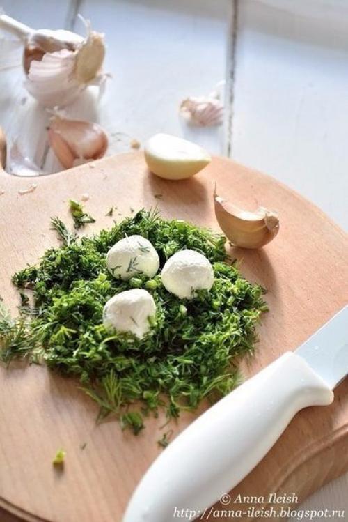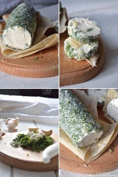 2. через 2 дня накрошила свежего укропа, порубила мелко чеснока и еще хорошую щепотку соли. И обваляла сыр в этой смеси, сформовав сырный батончик.
