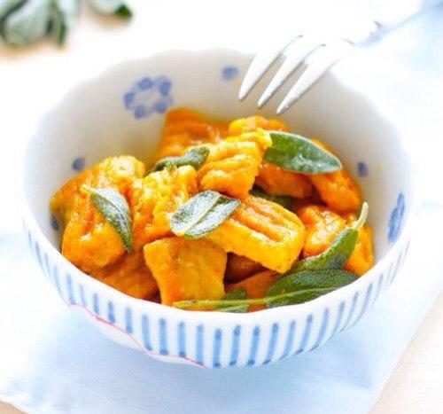 Ньокки: тыква - 300 грамм желток - 1 шт. мука - 150 грамм 1 ч. л. Карри (или куркумы для цвета) 1 ч. л. сушеного тимьяна соль, перец, мускатный орех.
