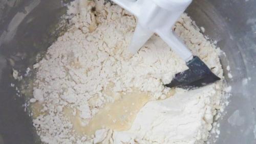 Перетереть муку с маслом в крошку, можно это сделать с помощью вилки. Затем влить молоко и добавить яичный белок.